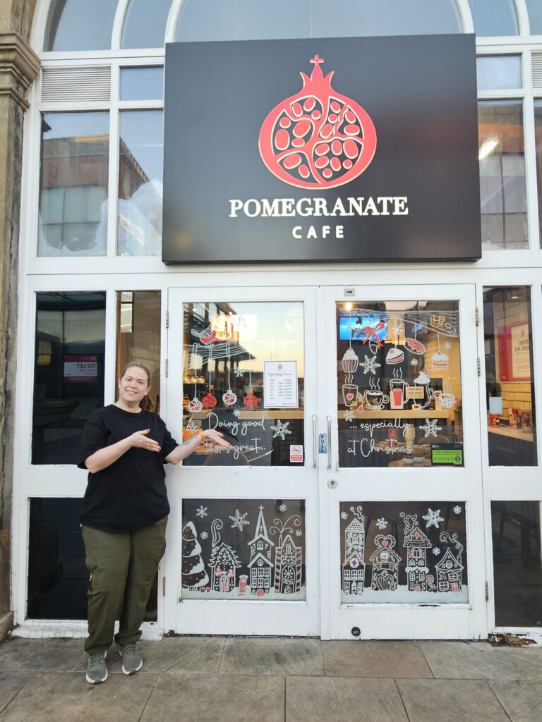 Charlotte recently brought her artistic skills to the Good Shepherd’s social enterprise café, Pomegranate, by painting its window with a Christmas design to help make it more eye-catching during the festive season. Any profit made from the café goes directly towards funding the Good Shepherd’s free to access services, making her contribution even more impactful.